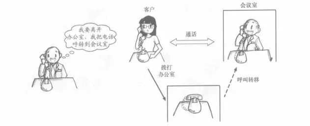 呼叫后轉(zhuǎn):你和某個客戶溝通,發(fā)現(xiàn)客戶的問題涉及到專業(yè),你無法回答時,你需要另一個更專業(yè)的同事來接聽,最好的方式就是在通話過程中把電話轉(zhuǎn)移到你同事的電話上,這就是呼叫后轉(zhuǎn)---在呼叫建立之后轉(zhuǎn)移當(dāng)前的通話。
