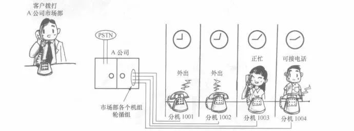 若干個分機形成一個組,當(dāng)一個電話呼叫其中分機的時候,該分機占線,PBX自動轉(zhuǎn)到下一個分機,若在占線,繼續(xù)轉(zhuǎn)到下一個分機去,直到某個分機接聽,或者所有分機占線。